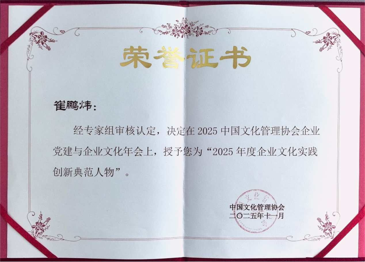 在年会备受瞩目的荣誉表彰环节,集团公司凭借在企业党建与文化建设领域的卓越成效,从全国400余家参评单位中脱颖而出,斩获多项重磅荣誉。其中,集团精心提炼总结的《党建引领聚合力 深融双创促发展》实践案例,荣获大会“党建强企优秀案例一等奖”;集团党委书记、董事长崔鹏炜以其在推动企业文化创新与实践方面的突出领导力和显著贡献,被授予“2025年度企业文化实践创新典范人物”称号。