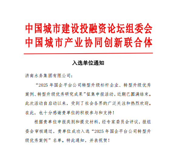 12月4日,“2025中国城市产业合作大会暨第18届城市建设投融资论坛”在南京举行,济南水务集团凭借卓越的转型实践,成功斩获“2025年国企平台公司转型升级优秀案例”殊荣。集团领导带队出席论坛,代表企业接受荣誉授牌,这一奖项既是对集团转型发展成果的权威认可,更是对其深耕民生水务、护航城市用水的高度肯定。