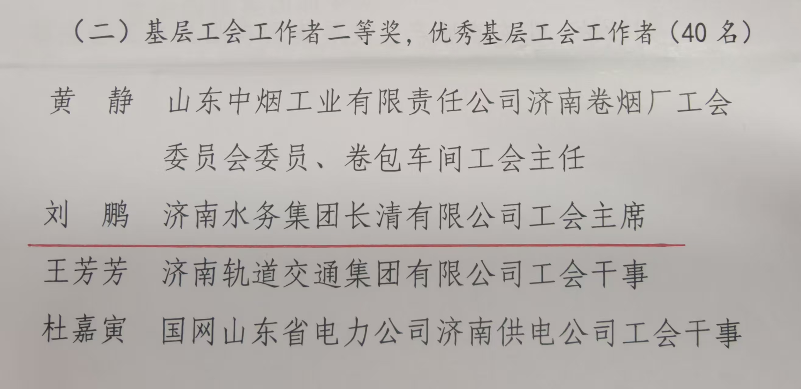 近日,济南市总工会公布2025年新时代职工之家争先创优竞赛结果,集团工会凭借扎实的基层建设与优质的职工服务,再创佳绩!济南水务集团长清有限公司营业部工会小组荣获"模范职工小家"、工会主席刘鹏获评"优秀基层工会工作者"荣誉称号,用实干实绩彰显了工会组织活力与责任担当。