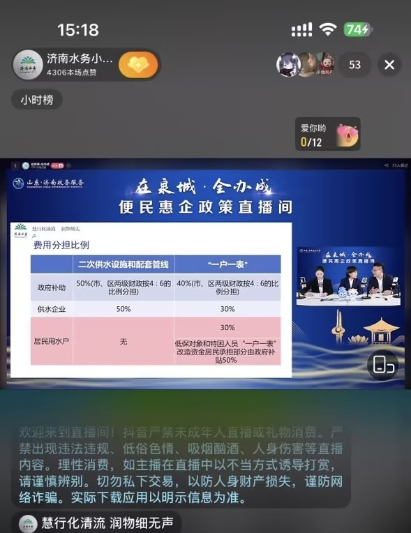 这次直播在省市一体化行政审批服务大厅数字政务专区进行,并通过济南市行政审批服务局“泉惠企”微信视频号、“在泉城·全办成”抖音号及“济南水务集团小白热线”抖音号等多渠道同步推送。济南水务集团系统介绍了济南供水服务概况、智慧水务服务便民新举措,并重点解读了居民住宅小区供水设施改造政策。