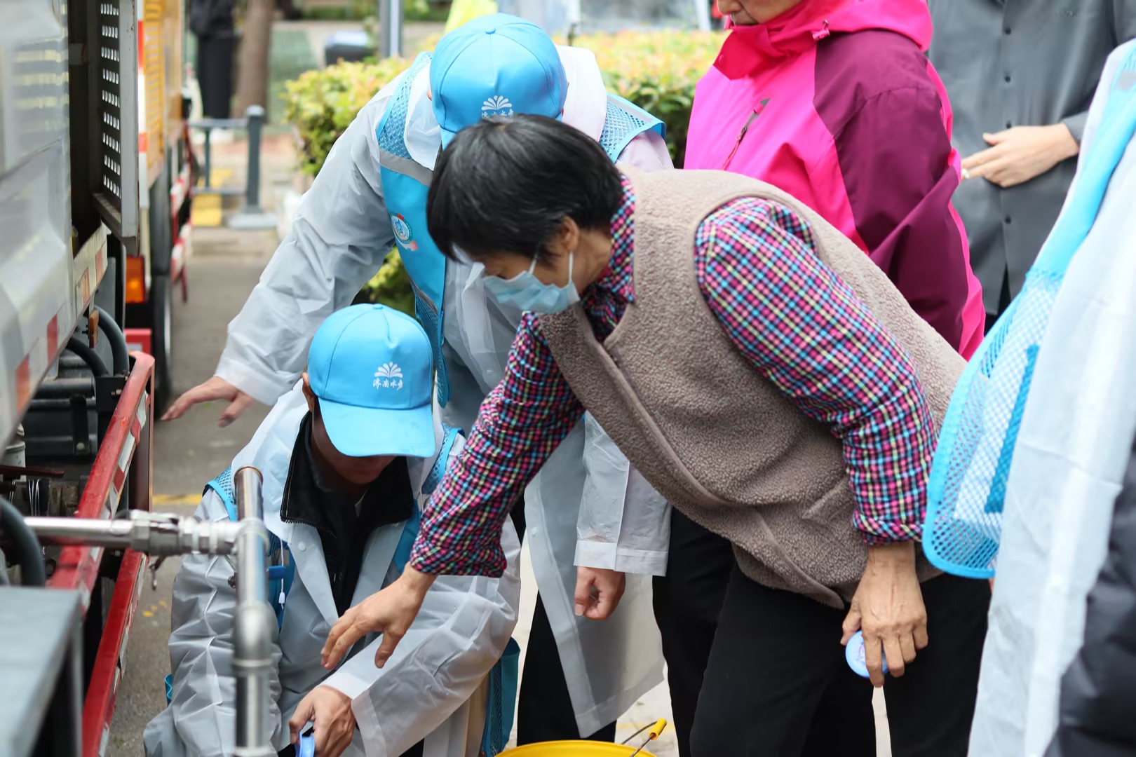 在世茂天城取水点,志愿者裤腿被水溅得湿透,却依然微笑着为每一位居民接满水桶。这一幕被路过的市民拍下,在社区微信群里收获满屏点赞。