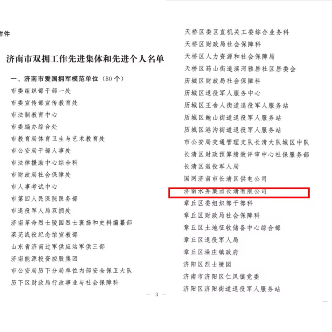 近日,中共济南市委、济南市人民政府、济南警备区联合印发《关于表彰济南市双拥工作先进集体和先进个人的决定》,济南水务集团长清有限公司严格落实集团的统一领导和部署要求,凭借扎实的双拥工作成效,获评济南市爱国拥军模范单位。这是继“济南市退役军人思想政治工作示范点”后,公司在双拥领域斩获的又一重要荣誉,也是对集团双拥工作整体部署落地成效的有力印证。