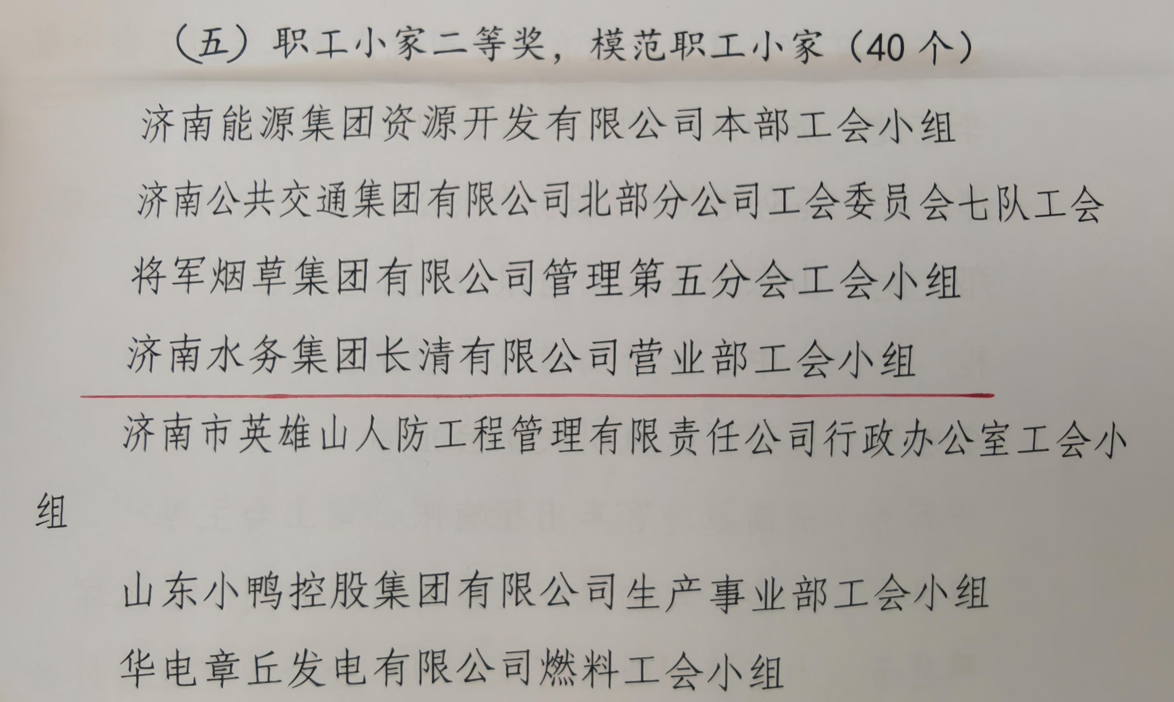 近日,济南市总工会公布2025年新时代职工之家争先创优竞赛结果,集团工会凭借扎实的基层建设与优质的职工服务,再创佳绩!济南水务集团长清有限公司营业部工会小组荣获"模范职工小家"、工会主席刘鹏获评"优秀基层工会工作者"荣誉称号,用实干实绩彰显了工会组织活力与责任担当。