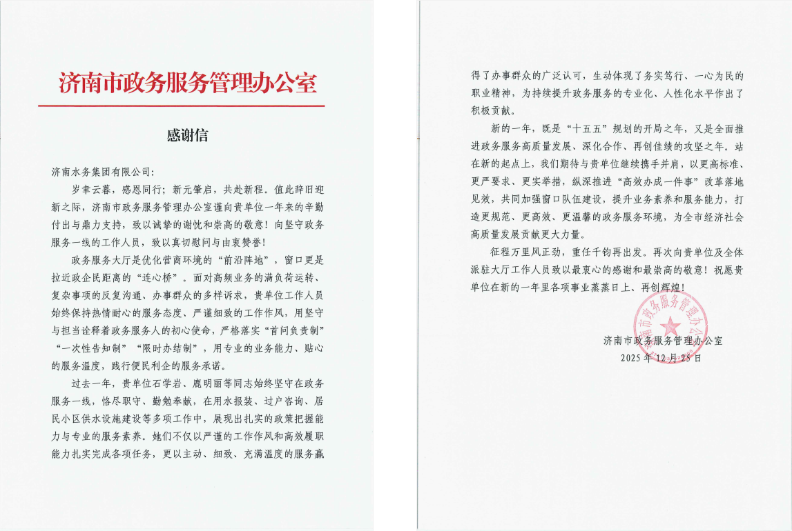 近日,济南市政务服务管理办公室向济南水务集团发来感谢信,对集团派驻市政务服务大厅窗口工作人员一年来的辛勤付出与专业服务给予高度肯定,并对济南水务集团石学岩、鹿明丽两位同志提出特别表扬。这封感谢信,折射出集团一线员工的“实干与温度”。