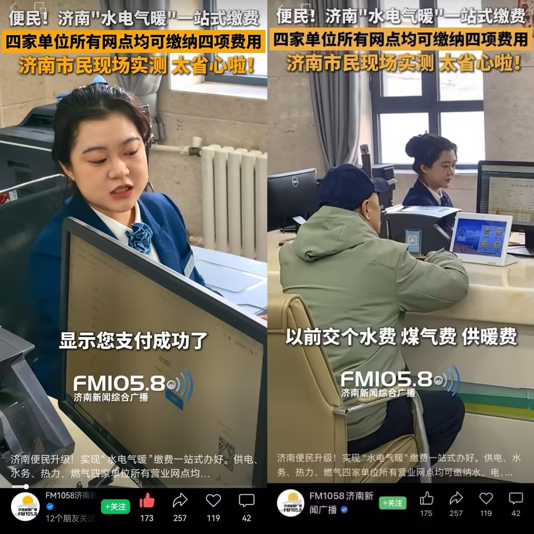 今年年初,市发展改革委组织济南水务集团、国网济南供电公司、济南热力集团、山东港华燃气集团四家单位,对四供行业便民缴费服务情况进行了专项调研,并结合实际研究“线上+线下”一站式缴费模式。为落实市委、市政府关于推行“水电气暖一站式缴费”的工作要求,济南水务集团积极响应,主动协作,通过扎实举措让“数据多跑路、群众少跑腿”,将便民承诺转化为泉城市民触手可及的便利与温暖。