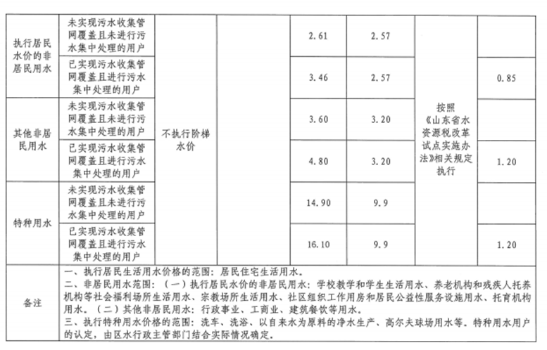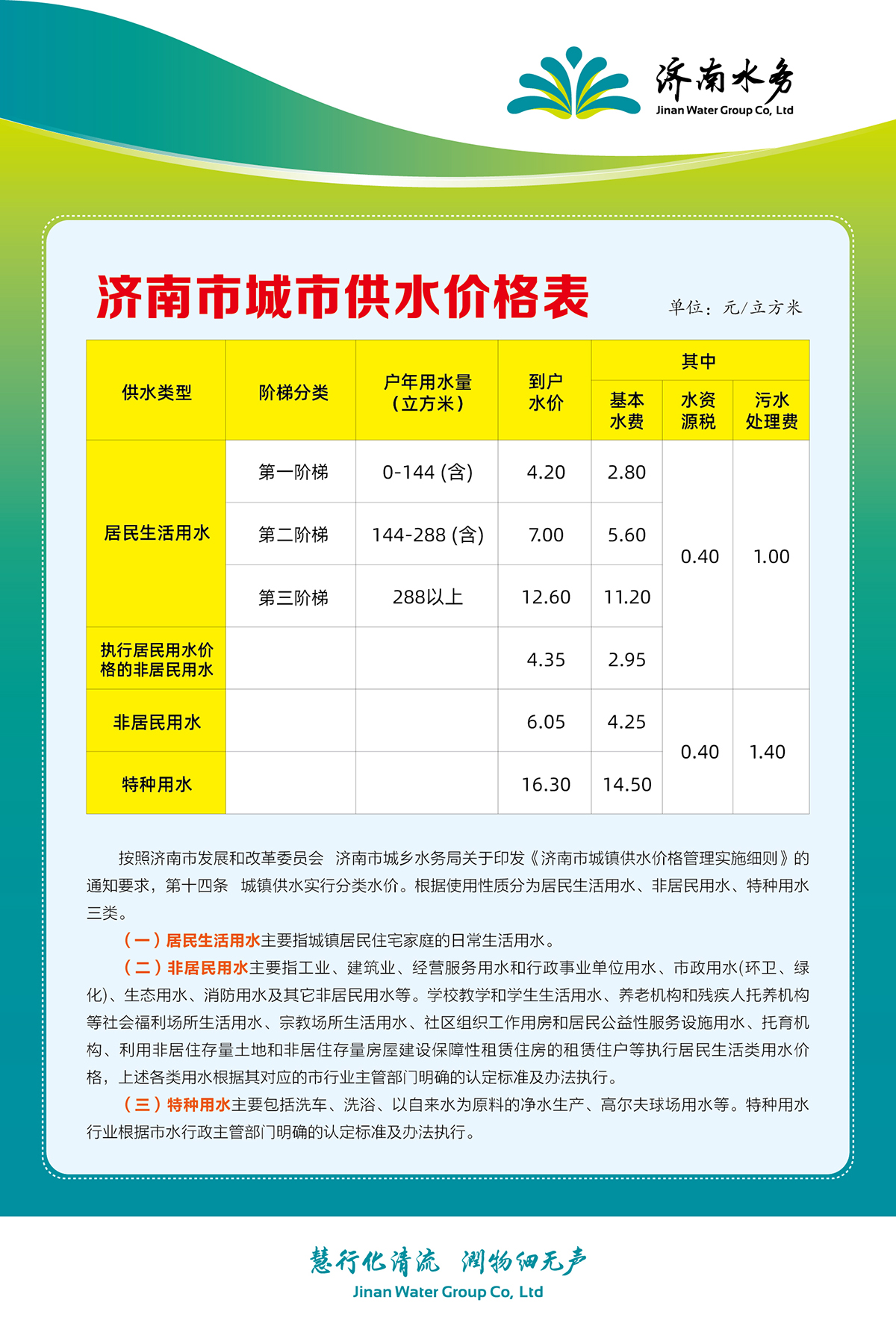 1、按照济南市物价局《关于调整济南市城市供水价格的通知》(济价格字【2015】26号)规定,自2015年5月1日起,对已实施“一户一表”抄表到户的居民生活用水户实施阶梯水价,对非“一户一表”居民生活用水价格进行调整。